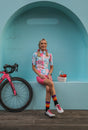 Kate is wearing a S jersey and S bib. Pair with our PINK GOES FASTER bibshort and Wave and Fly Performance Sock.